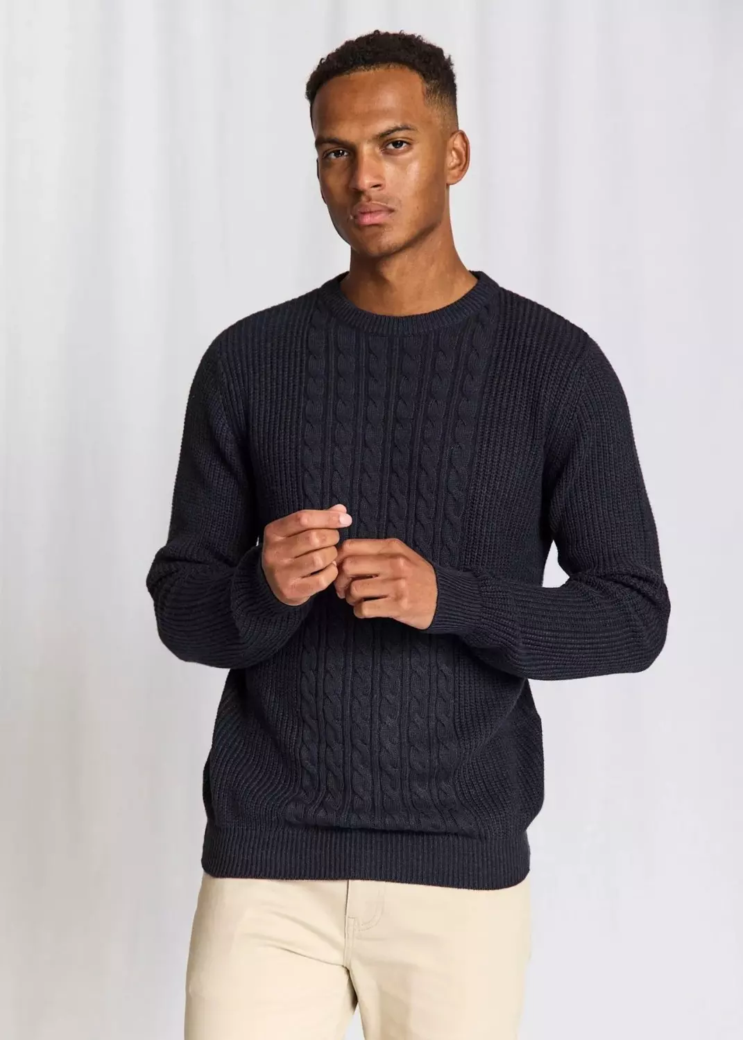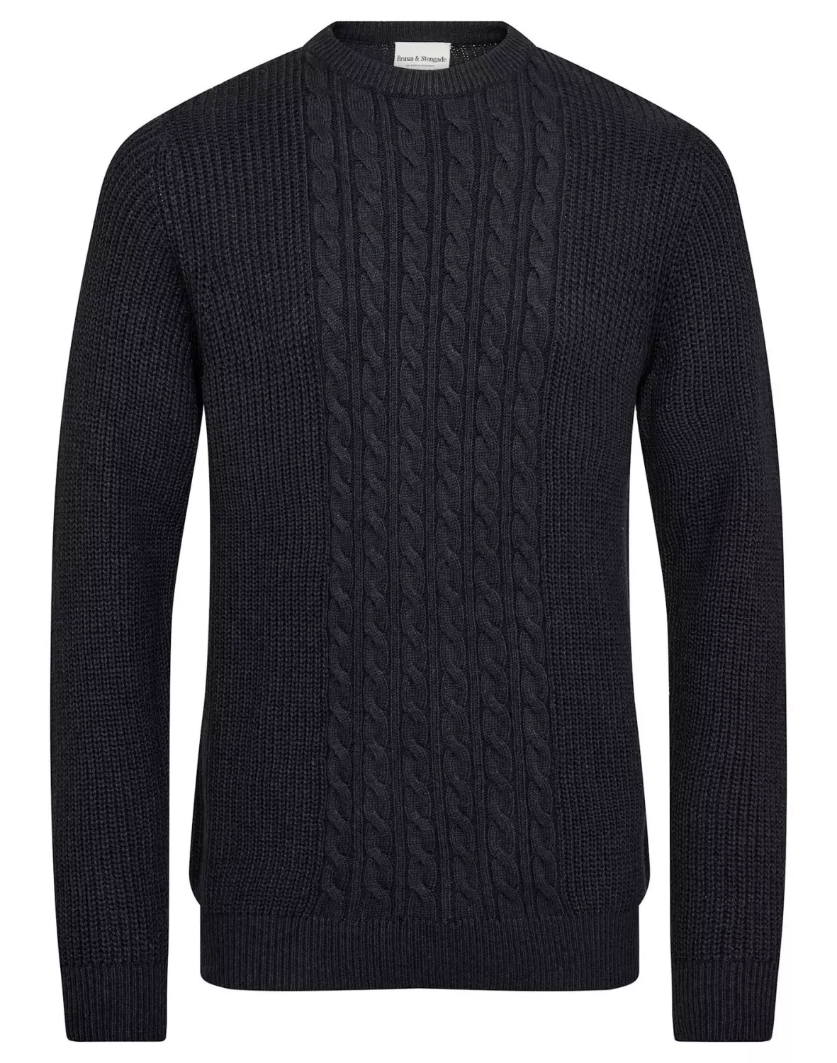 Kraftig o-neck sweater i en blanding af bomuld, rayon og nylon, designet med kabelstrikdetalje foran og ribstrik på ryg og ærmer. Sweateren har et tidløst fit, der giver både varme og komfort til hverdagsbrug.