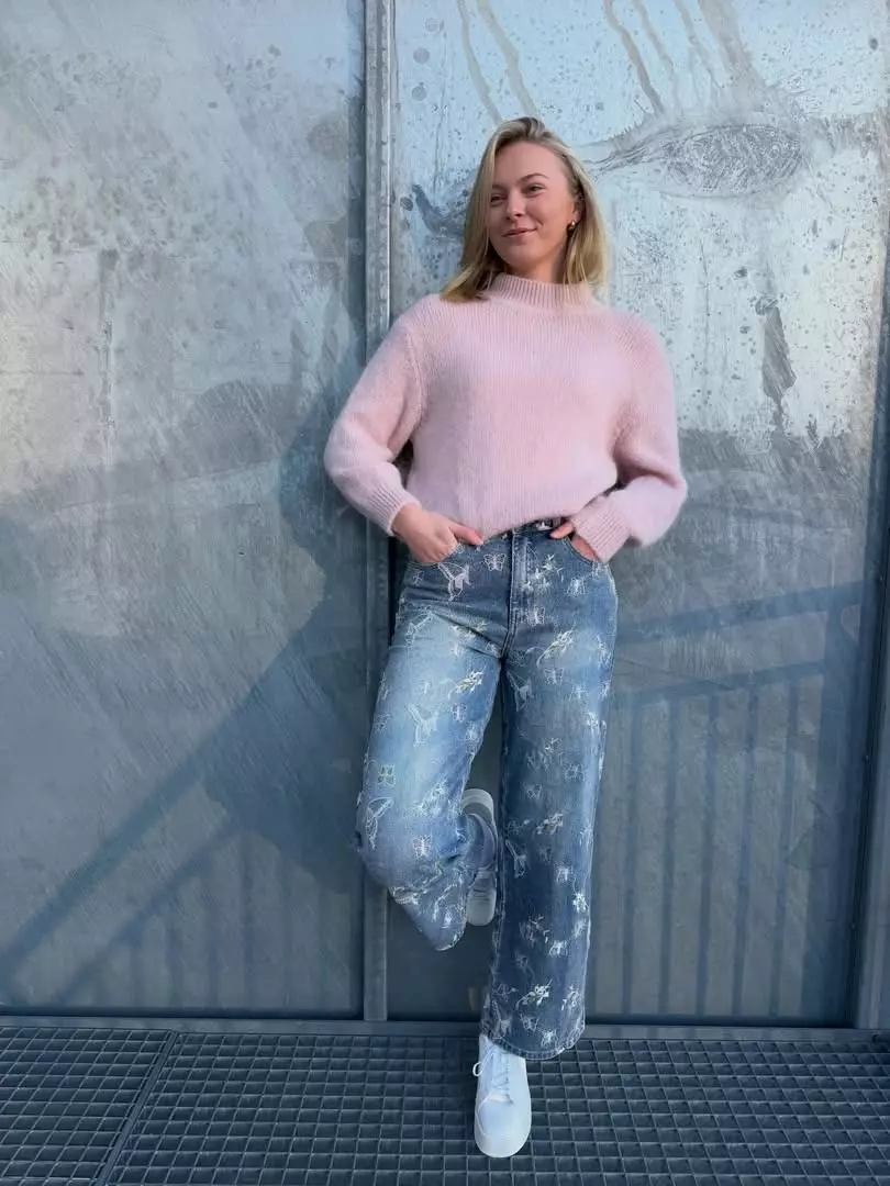 Tøff olabukse med broderi og rette vide bein. 73% bomull, 25% polyester og1% viskose