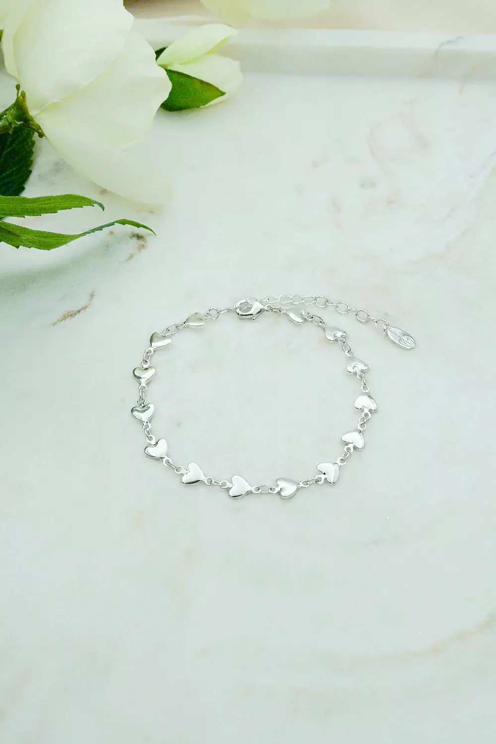 Et nydelig og feminint armbånd bestående av små, blankpolerte hjertelenker i sølvbelagt messing. Den romantiske stilen gjør dette smykket til en vakker gaveidé – eller en kjærlig detalj i din egen smykkesamling.