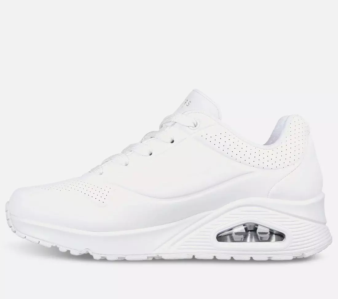 Klassisk luftdempet komfort får en frisk oppdatering med Skechers Street Wide Fit: Uno – Stand on Air. Denne snørede moteskoen har en glatt, perforert syntetisk overdel med en Air-Cooled Memory Foam innersåle og en Skech-Air synlig airbag mellomsåle.
