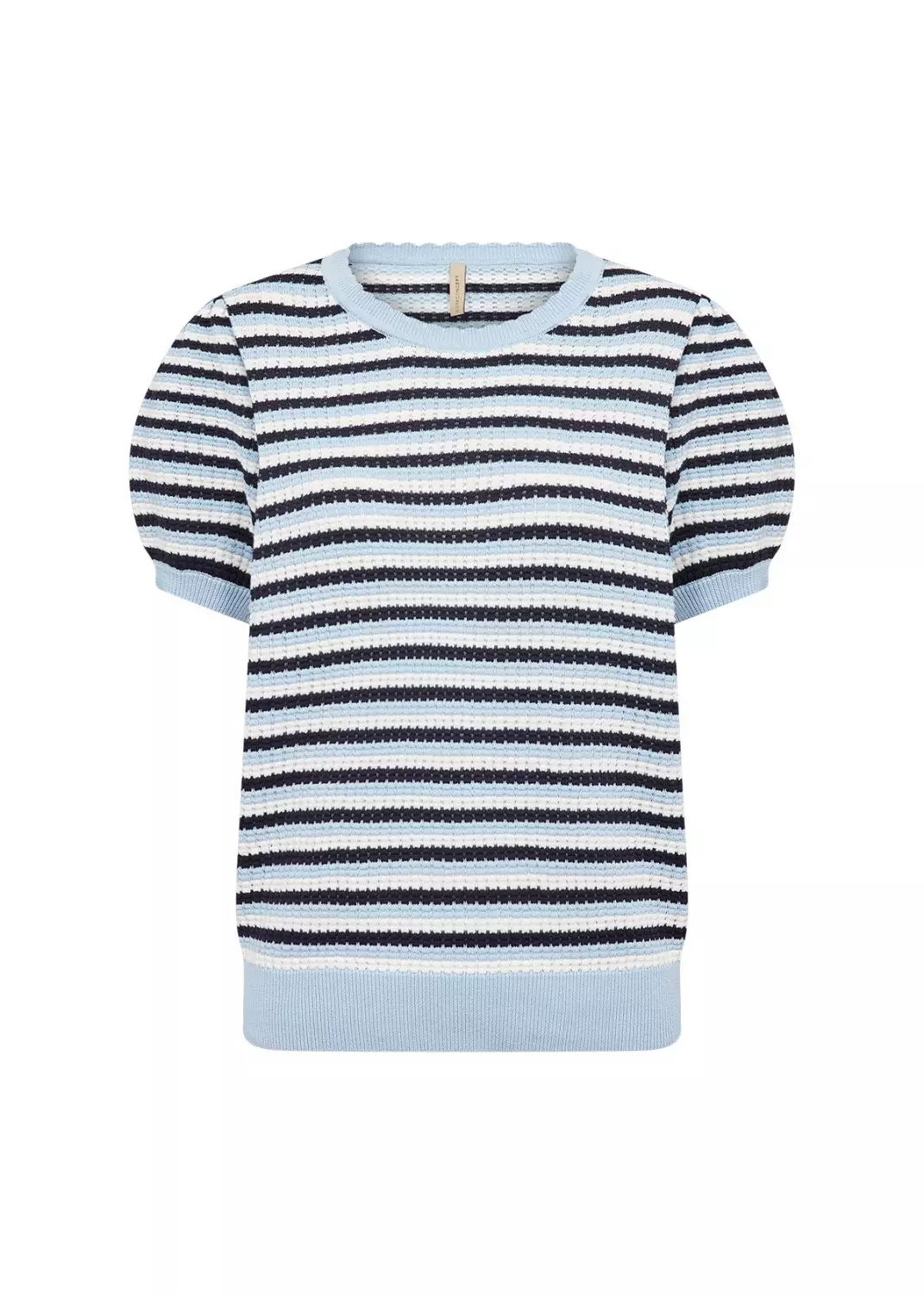 SC-CAMILA 1 er en genser laget av 100 % økologisk bomull. Den har en elegant rund hals, korte puffermer og et lekent stripemønster. Kombiner den med favorittjeansene dine eller et skjørt for et stilig og komfortabelt utseende.