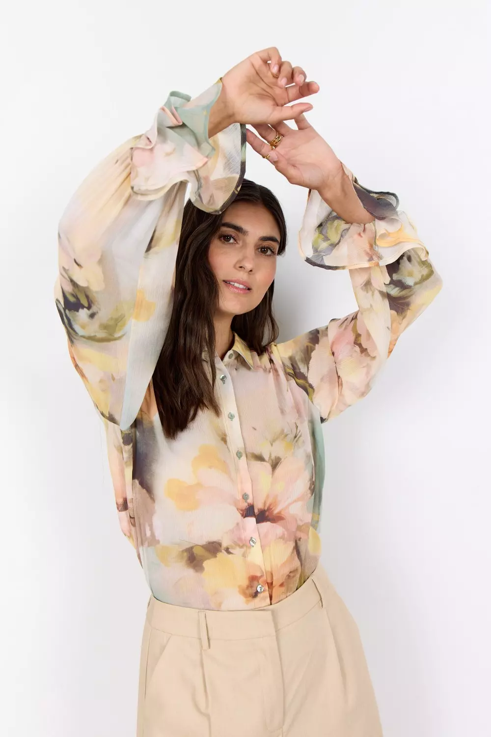 SC-CARMEN 1 er en skjorte laget av 100 % resirkulert polyester. Den har en spiss krage, knapper foran og rysjer i mansjettene med et elegant blomstertrykk. Kombiner den med skreddersydde bukser eller et elegant skjørt for et kult utseende.