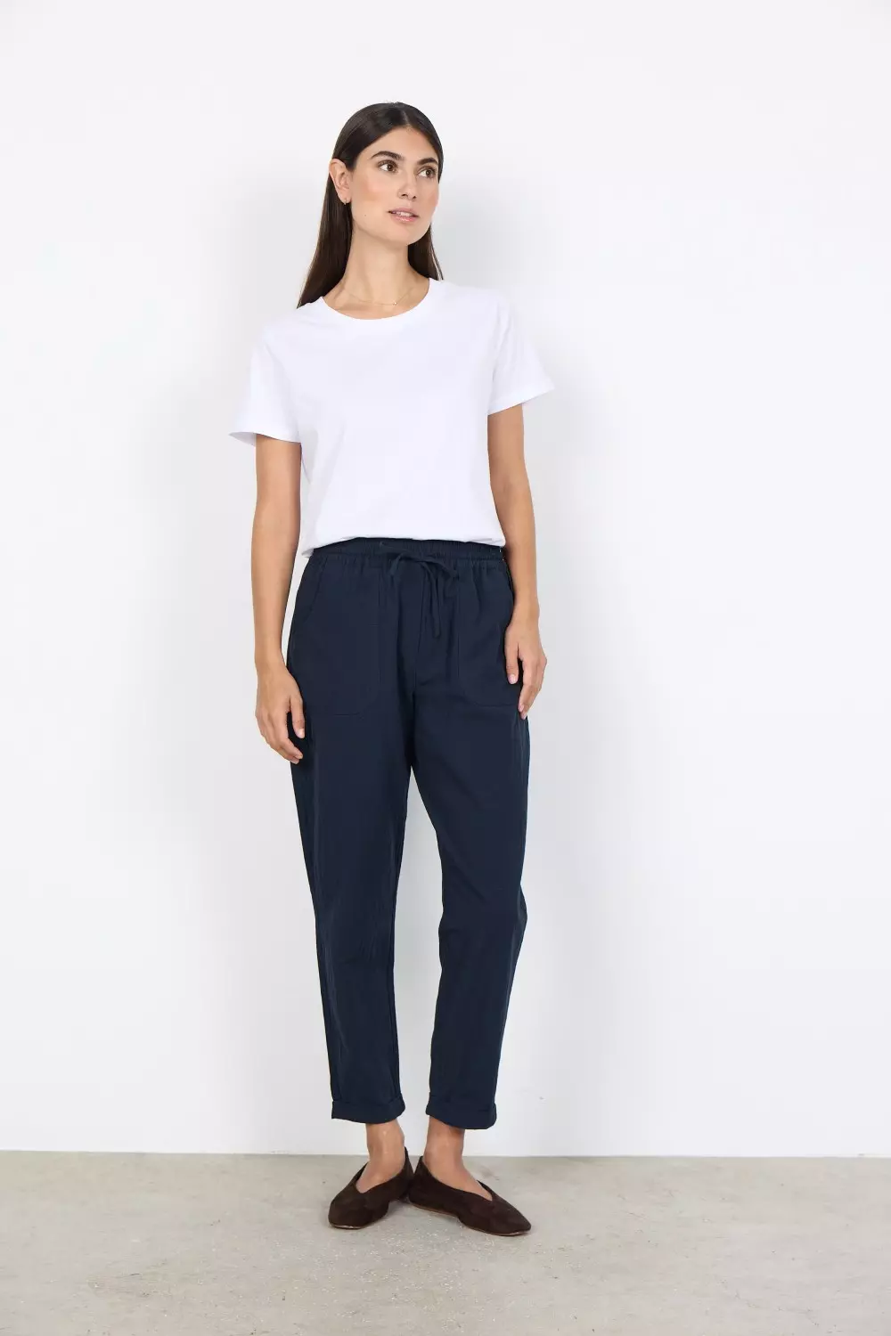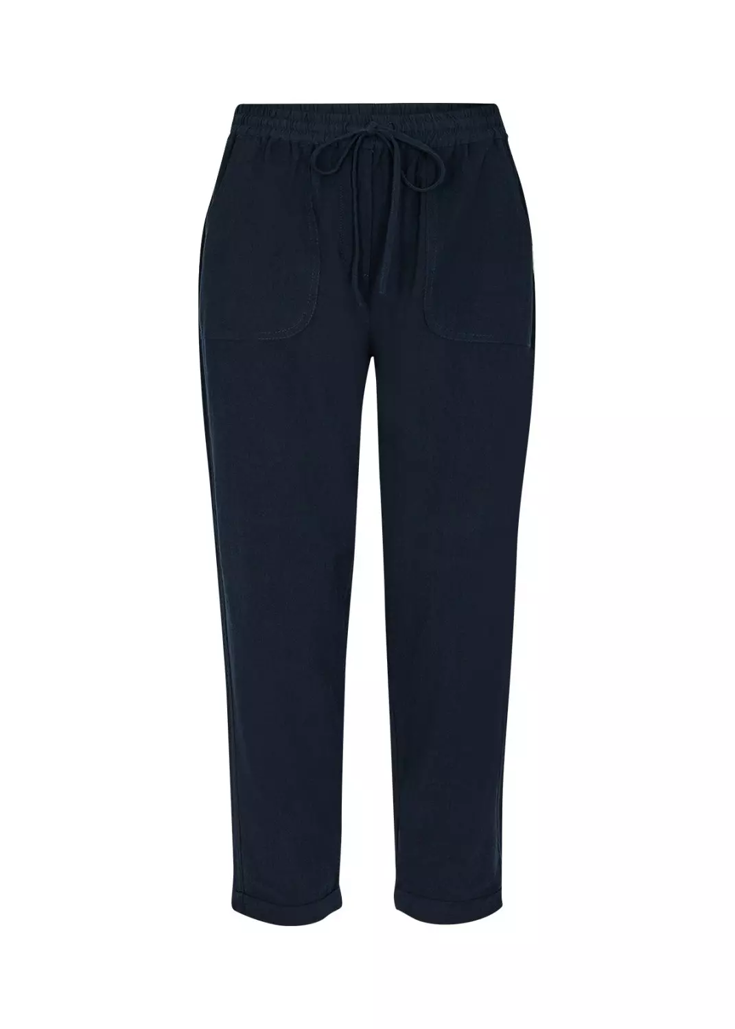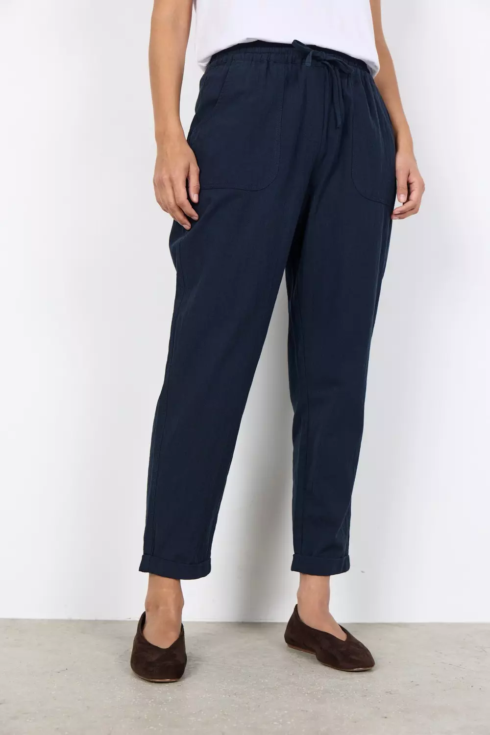 SC-Cissie 10-c er et komfortabelt par bukser i 100 % bomull. De har to lommer bak, strikk og knyting i livet og kort benlengde. Style disse buksene med en fargerik strikket genser for kjøligere dager.