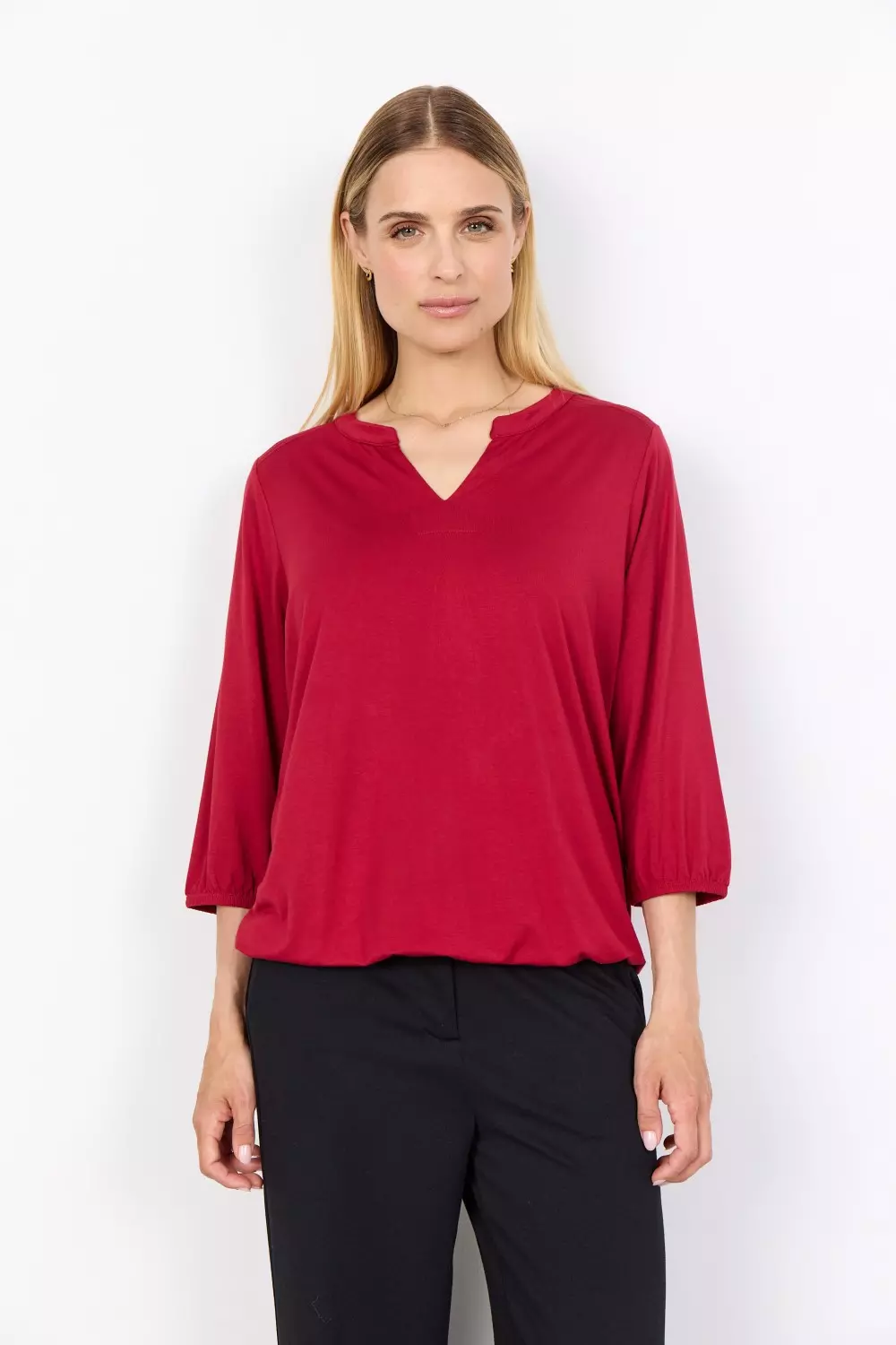 SC-MARICA 338, blusen, er laget av 93 % lyocell og 7 % elastan. Den har V-hals, trekvartlange ermer med elastiske mansjetter og en avslappet passform. Kombiner den med skreddersydde bukser for et elegant utseende eller jeans for noe mer avslappet.