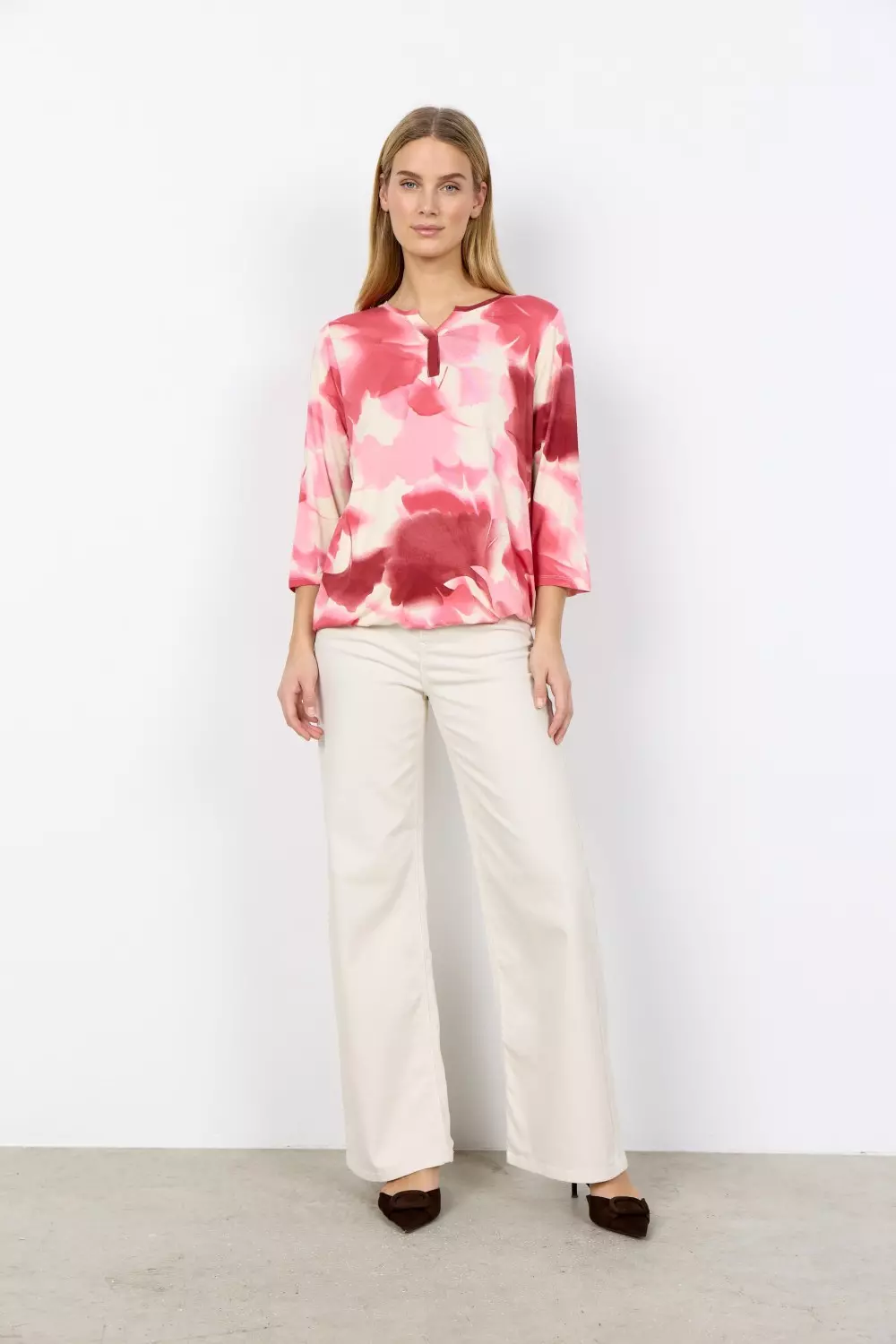 SC-MARICA AOP 351 er en bluse laget av 93 % lyocell og 7 % elastan. Blusen har en diskré halsutringning med et lite V-snitt og et elegant blomstertrykk, komplementert av 3/4-ermer. Bruk den med skreddersydde bukser for et raffinert utseende eller jeans for et koselig hverdagsantrekk.